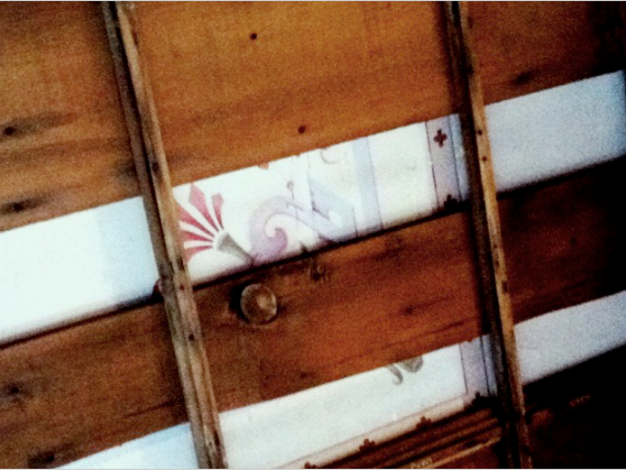 Before construction began, Melrose Glass was engaged to carefully remove and store the remaining glass panes (some pieces were missing). Once removed, we were able to see that behind the glass panes was wood strapping that held in place the original plaster ceiling. In between sections of strapping we were able to see the original ceiling which was embellished with decorative painting, seen in this photo at the top of this post.We carefully removed the wood strapping in hopes we could better photograph the original painted ceiling, but unfortunately the plaster immediately collapsed when the strapping was removed.