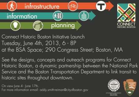 ConnectHistoric Boston is an initiative between the National Park Service and the Boston Transportation Department to promote improved access for visitors and workers in the downtown historic area. It will make easy to navigate, safe, and engaging links between downtown transit, business, and historic sites. Funded by the Federal Transit Administration, the initiative has an extensive advisory and inter-agency group with representatives from neighborhood councils, advocacy groups, non-profits, as well as Federal, State, and local government representatives.