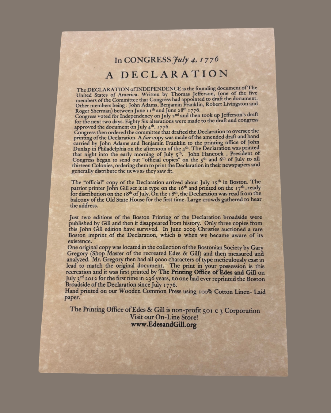 Edes & Gill, a longtime historic printing press nonprofit that has operated along the Freedom Trail for years, gifted this authentically reproduced Declaration of Independence to HBI in honor of the nation’s 250th. This copy was hand-printed on their Wooden Common Press on 100% Cotton Linen-Laid paper.