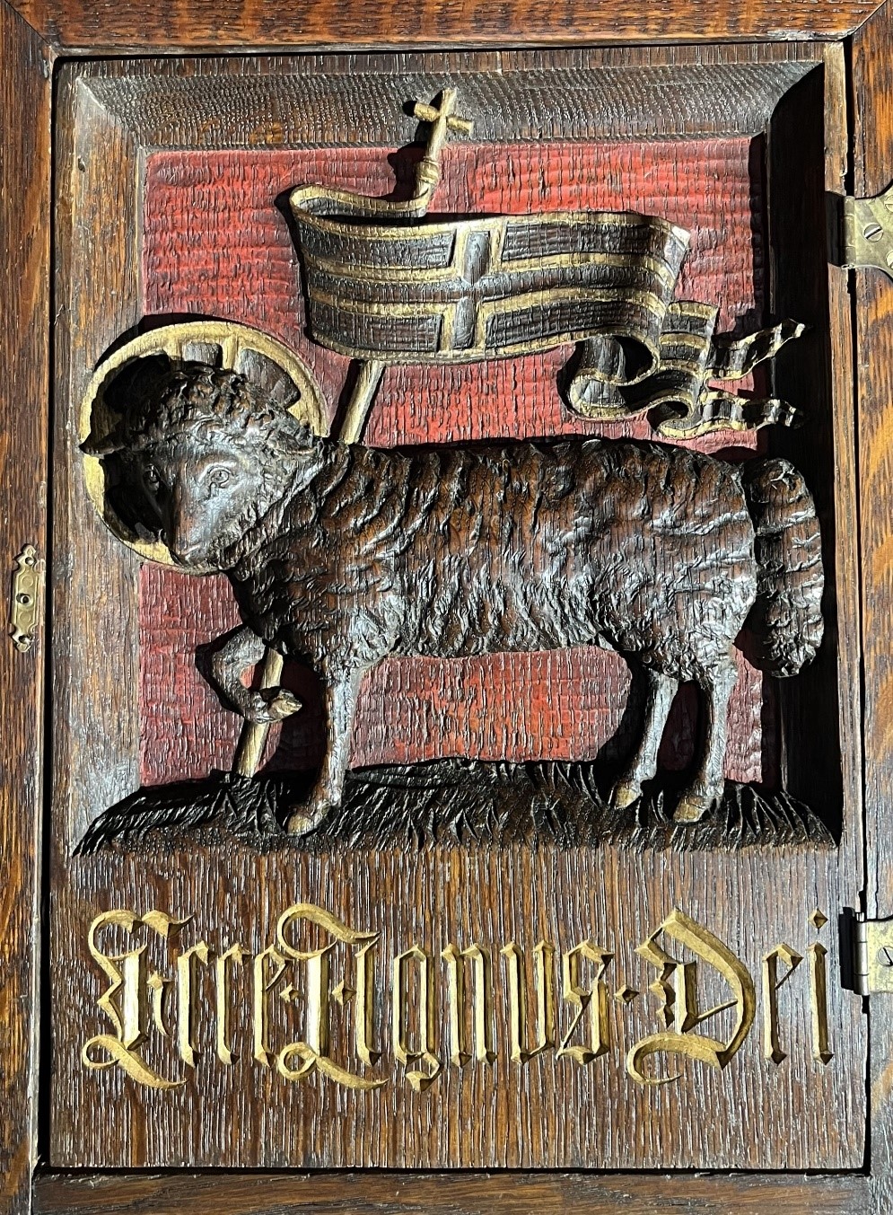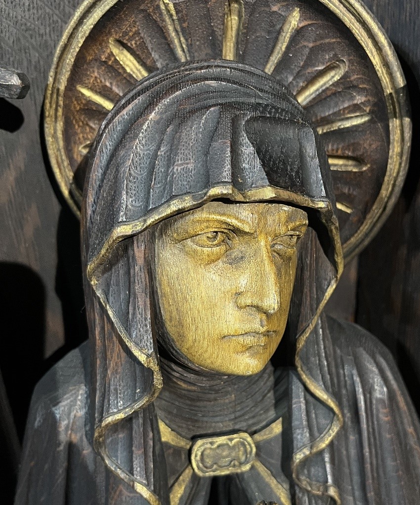 I was contacted by the Spencer Preservation Group to undertake a conservation treatment for the wonderful carved oak reredos in the chapel. The reredos, carved and signed by Johannes Kirchmayer, depicts a central Christ figure rising from the cross behind him. There are niches on either side that contain a carved central figure surrounded by four smaller figures. The four points of the cross contain a gilded panel with a carved figure or animal and the name of one of the apostles: “S. Lucas” above Christ’s head, “S. Marcus” at his left hand, “S. Mathew” at his right hand, and “S. Johan” below his feet. The reredos has a carved and pierced gallery at the top and a central carved and pierced hood over the Christ figure. A gallery of linenfold carved panels is below the figures; below those is a central tabernacle depicting the lamb. An inscription beside the tabernacle reads: “To the Glory of God and in loving memory of Susan White Seaver Walker December 16 1824 – April 21 1903”. The surface appears to be finished with a chemical stain and a resin spirit varnish, with decorative elements that have been oil gilded.