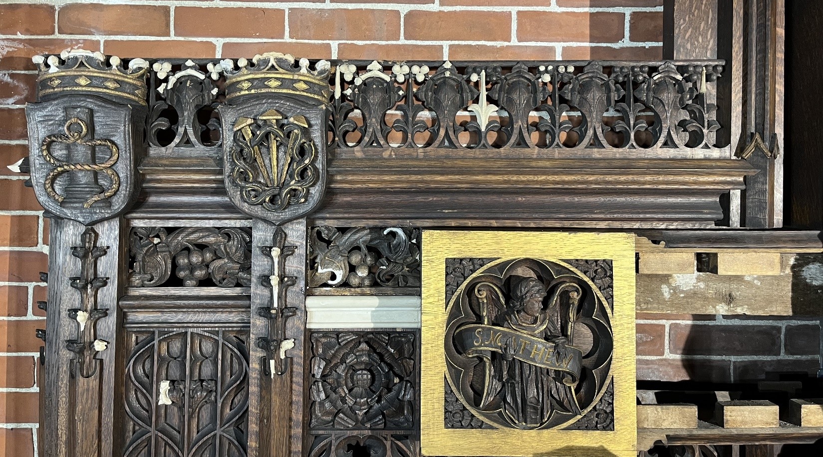 After work on the Christ figure had been completed, the work on the reredos commenced. Layers of dust and dirt were removed from the surface, revealing the beauty of the carved oak surface and the gilded elements underneath. Over thirty carved decorative elements on the upper gallery were missing, presumably chewed by squirrels that had nested in the chapel when it was in disrepair. Other elements had detached over time and were lost.