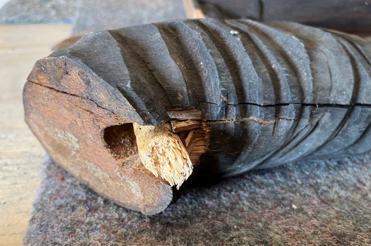 The detached proper left arm of the figure. The force of the impact had driven the dowel sideways, breaking through the surface of the arm.