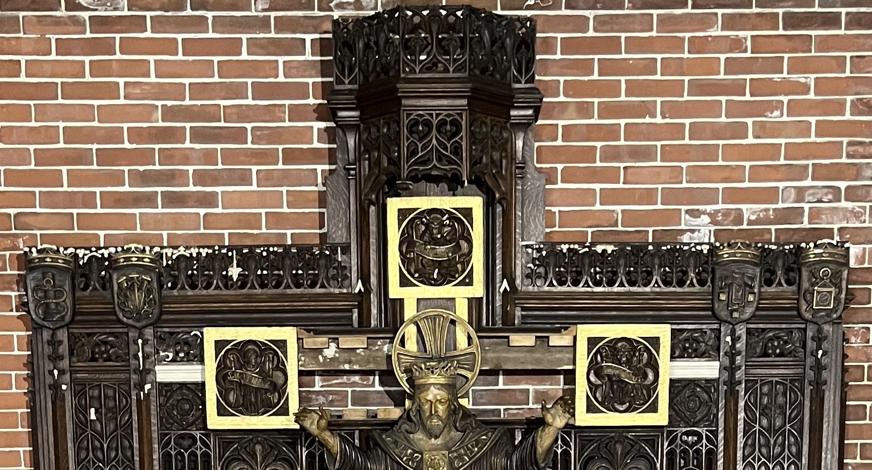 St. Luke’s Chapel (c.1901) is nearing the end of a four year long rehabilitation that has restored the sanctuary space with a fully accessible basement that now holds restrooms and a kitchenette. Wenda Kochanowski is a Decorative Arts Conservator and has been working with the Spencer Preservation Group on the rehabilitation of St. Luke’s Chapel. Here, Wenda offers a glimpse into her work restoring the intricate wooden reredos by master woodcarver Johannes Kirchmayer in St. Luke’s sanctuary.
