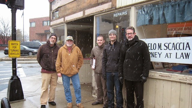 After many months of planning, we are pleased to announce that the Vertullo Buildingstorefront rehabilitation has at last begun. Try as we might to have all of the pieces into place so that we could begin the work in the warm weather, it didn?t work out that way and our contractor, MJ Mawn and his team had to bundle up to begin demolition this week in the snow. Fortunately, we anticipate the work to only take a couple of months, barring any unforeseen complications.