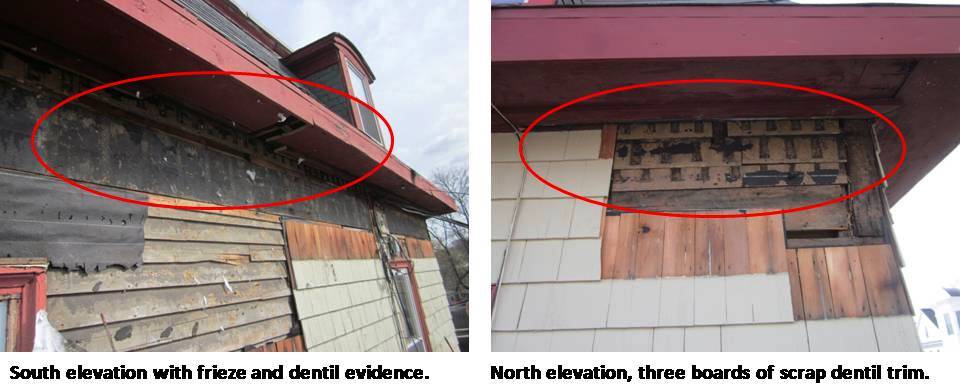A bit of a red herring turned up on both the south and north elevations of the buildings, which caused initial excitement, and then confusion. On the south side, we uncovered a trim band at the top of the frieze that showed evidence of dentil molding, a not-uncommon detail on other buildings of a similar style in the neighborhood. When we uncovered the corresponding frieze on the north side of the building, we found not one but THREE trim pieces, stacked one over the other, with evidence of dentils. This turned out not to be a particularly elaborate example of architectural ornamentation, but scrap trim that had been nailed in place to even out the wall surface prior to installing the cedar shingles.