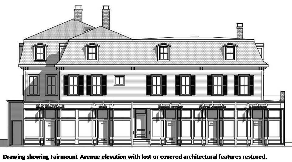 At any rate, the information we have uncovered has informed our design for the rehabilitation, and we plan to restore or add back many of these covered or lost details back to the building. The drawing below shows the Fairmount Avenue fa?ade as rehabbed. We believe that this makes a strong statement that not only thoughtfully reflects the building?s original architectural character, but will create an attractive location where small businesses can flourish and where people will be proud to live.