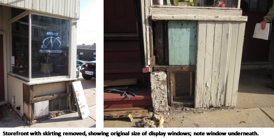 Finally, we removed portions of the kneewall of two storefronts, revealing the original lower kneewall and skirting, which, surprisingly, contained short, multi-pane window sash at the basement level.